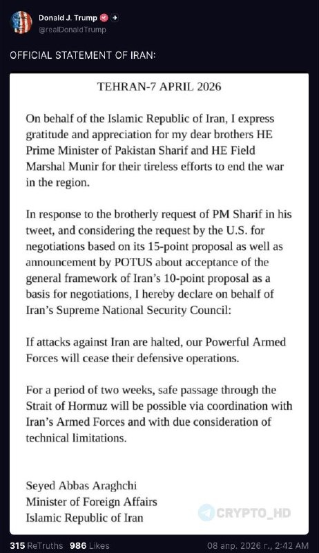 »: От имени Исламской Республики Иран я выражаю благодарность и признательность моим дорогим братьям – Его Превосходительству премьер-министру Пакистана Шарифу и Его Превосходительству фельдмаршалу Муниру – за их неустанные усилия, направленные на прекращение войны в регионе. В ответ на братскую просьбу премьер-министра Шарифа, изложенную в его твите, а также принимая во внимание просьбу США о переговорах на основе их предложения из 15 пунктов и заявление президента США о принятии общего рамочного подхода иранского предложения из 10 пунктов в качестве основы для переговоров, настоящим от имени Высшего совета национальной безопасности Ирана заявляю: Если атаки против Ирана будут прекращены, наши могущественные вооружённые силы прекратят свои оборонительные операции. На период в две недели безопасный проход через Ормузский пролив будет возможен по согласованию с вооружёнными силами Ирана и с должным учётом технических ограничений. Ранее: переговоры в пятницу Crypto Headlines