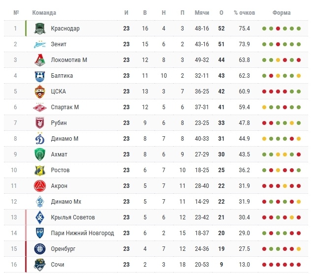 Приветствую, Вас, уважаемые читатели! В Российской Премьер-Лиги сыграно уже 23 матча. Голов в прошлом 23 туре было забито сравнительно немного, всего 22 гола в 8 матчах-это не лучшая результативность. Потихоньку входят в свой тонус команды после зимней паузы. Для начала обратимся к турнирной таблице прежде, чем приступить к прогнозам. Безусловно, центральным матчем 24 тура РПЛ будет противостояние лидирующих команд Зенит-Краснодар. Обе команды сделали небольшой отрыв от остальной группы преследователей и имеют права на две осечки, чтобы не потерять второе место. Но естественно, у обоих команд присутствуют амбиции-выиграть чемпионат России. Краснодар, как действующий обладатель титула, будет защищать его, а Зенит будет пытаться вернуть чемпионство (именно ФК Краснодар в прошлом сезоне смог прервать серию чемпионств Зенита из 6 подряд сезонов). Анализируя последние кубковые матчи, сыгранные командами, то стоит отметить неуступчивый характер обоих коллективов с внимательной игрой в оборон