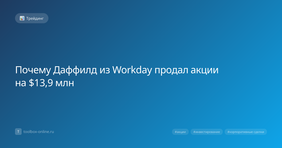 Даффилд из Workday продал акции на сумму $13,9 млн, что эквивалентно примерно 1,2 млрд рублей по курсу 2026 года. Сделка была завершена в июле 2026 года и включала продажу 250 000 акций по цене $55,60 за штуку. Основная цель — перераспределить капитал и снизить риск концентрации в одной компании. Причина №1 — необходимость диверсификации портфеля: держать 30 % стоимости активов в одной компании считается слишком рискованным. Причина №2 — покрытие налоговых обязательств, которые в 2026 году составили 15 % от прибыли от продажи. Рынок увидел положительный сигнал: руководитель компании демонстрирует уверенность в долгосрочной стратегии, а не спешку выхода. Инвесторы восприняли продажу как способ укрепления финансовой гибкости. Первый шаг — оценить налоговые последствия и выбрать оптимальный момент продажи. Затем следует распределить ордера, чтобы избежать резкого падения цены. Для расчёта используйте простую формулу: Прибыль = (Цена продажи – Средняя цена покупки) × Кол‑во акций – Налоги.
