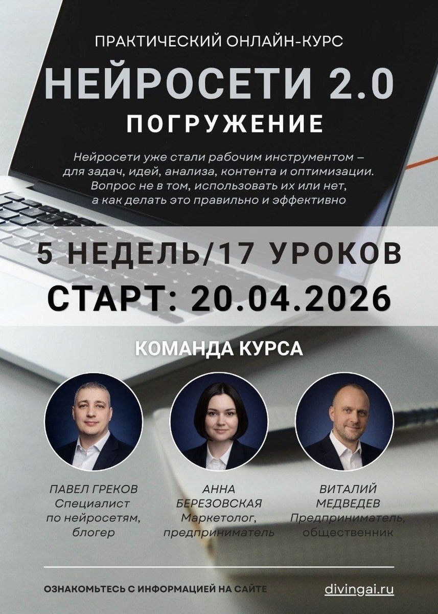 С нейросетями я создаю сайты, пишу тексты, генерирую контент, занимаюсь автоматизацией процессов. Экономия времени мощная 🔥🔥🔥 И на всём этом можно хорошо зарабатывать. Нейросети — это не будущее. Это уже настоящее. Но большинство людей либо боятся их, либо не понимают, как применять на практике. Мы запускаем второй поток онлайн-курса «Погружение в нейросети», чтобы провести вас от полного непонимания к уверенному использованию ИИ-инструментов. На курсе вы: - разберётесь, какие инструменты подходят именно под ваши задачи - научитесь работать с популярными нейросетями - освоите генерацию текста, изображений, видео и презентаций - поймёте, как использовать ИИ в работе, проектах, личных задачах - разберётесь с анализом больших объемов информации и базовыми основами автоматизации процессов. Формат обучения удобный и живой: короткие видеоуроки, домашние задания и поддержка в закрытой группе Max. 👉 Ознакомьтесь с программой курса и выберите подходящий формат обучения на сайте: htt