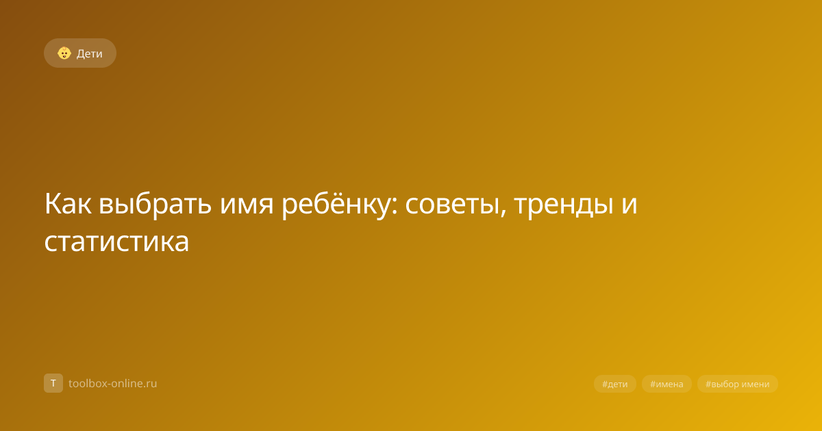 Выбор имени ребёнку — одно из первых важных решений родителей. На выбор влияют семейные традиции, значение имени, благозвучность с фамилией и отчеством, а также статистика популярности. В 2025 году самые популярные имена в России: Александр и София. Мода на имена циклична: имена бабушек и дедушек (Марфа, Тихон, Василиса) снова в тренде. Редкие имена делают ребёнка заметным, но могут вызвать сложности (постоянные уточнения). Популярные имена привычны, но в классе может быть 3–4 тёзки. Совет: не торопитесь с решением — у вас есть месяц после рождения для регистрации имени. Составьте шорт-лист из 5–7 имён и «примерьте» каждое в течение нескольких дней. Часто после рождения родители меняют решение, увидев ребёнка. Наш генератор имён подберёт варианты с учётом фамилии, отчества, значения имени и статистики популярности по годам.