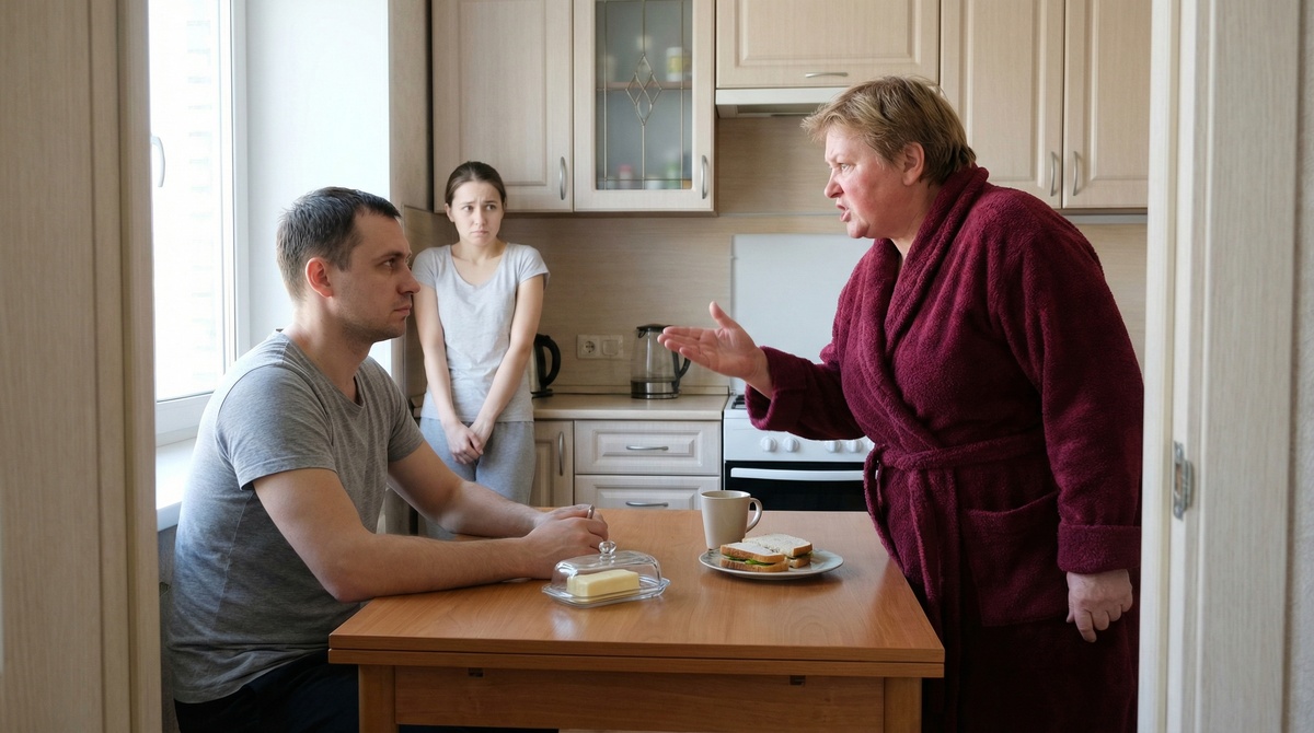 Оля застыла в кухонном проходе, переводя панический взгляд с мужа на мать.