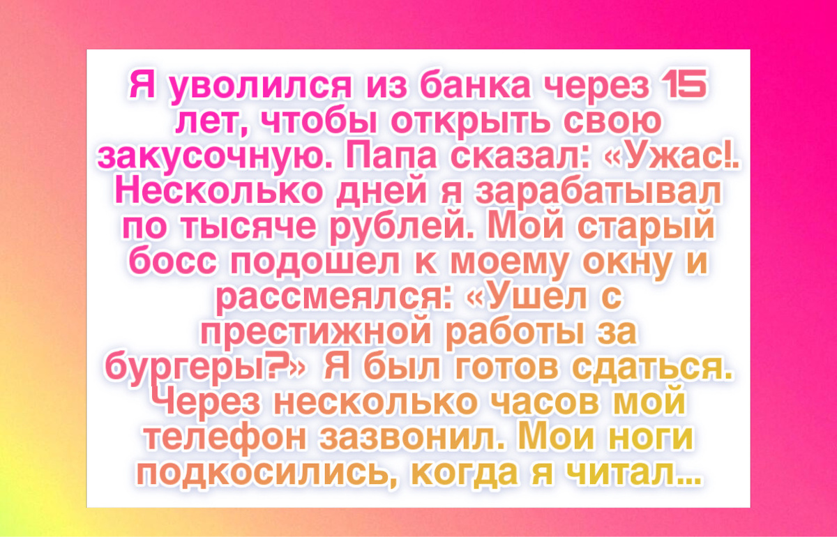 “Я ушел из банковской сферы после 15 лет работы и открыл фудтрак с фастфудом. Отец сказал: “Пора взрослеть”. Бывали дни, когда я зарабатывал 1500 рублей. Мой бывший начальник подошел к окну и усмехнулся: “Бросил работу с шестизначной зарплатой ради бургеров по 300 рублей?” Я почти сдался. Через несколько часов мне пришло уведомление. Я едва не сел на землю, когда прочитал отзыв от фуд-блогера с аудиторией 300 тысяч человек. Она написала: “Этот человек готовит не ради денег. Он готовит, потому что любит это. И это чувствуется”. На следующее утро у меня было столько заказов, что я не справлялся. Сначала помог соседский подросток, потом его мама, потом ее подруга. Через месяц у меня уже была команда и очередь. Отец увидел этот отзыв, приехал и встал в очередь, не говоря, что он мой отец. Когда подошел к окну, посмотрел на людей позади и сказал: “Я ошибался”. Теперь он приходит каждую пятницу. Недавно один клиент сказал: “Вы всегда выглядите счастливым”. Я ответил: “Так и есть”. За 15 лет в банке мне такого никто не говорил.”
