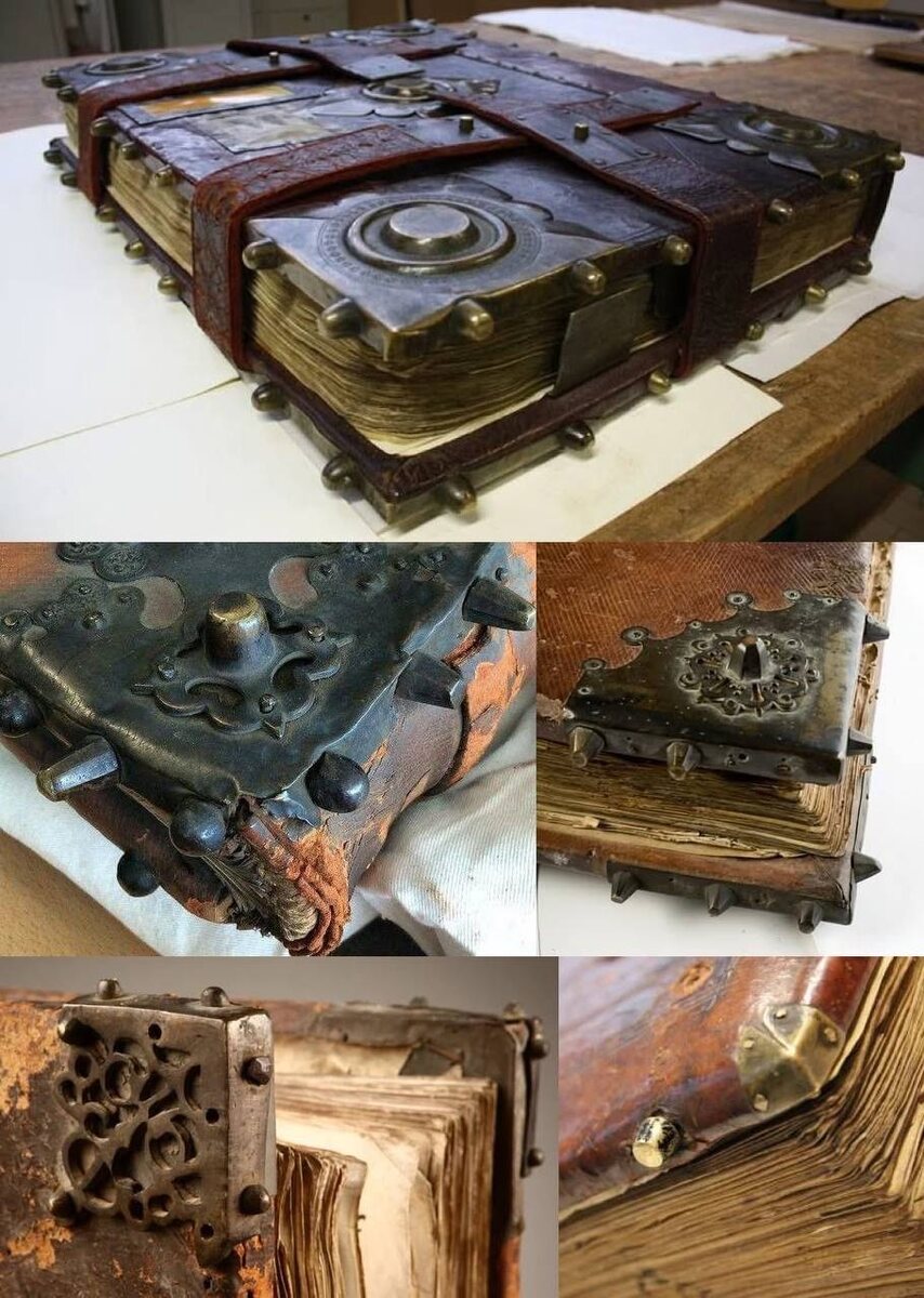 Это тяжёлый предмет из многих слоёв пергамента, массивных деревянных крышек, обтянутых кожей, и увесистого металлического переплёта. Некоторые тома весили несколько килограммов. Такой объём требовал защиты. Углы обложек укреплялись металлическими пластинами — на случай падения, удара, случайного столкновения. Книга должна была пережить не одно поколение читателей, а значит, её корпус проектировался почти как доспех. Но мастера-переплётчики шли дальше. На нижние крышки добавляли небольшие металлические выступы — миниатюрные ножки. Когда том выставлялся на библиотечную кафедру — нередко сколоченную из грубого дерева или вытесанную из камня — края кожаного переплёта не соприкасались с поверхностью напрямую. Не истирались, не намокали, не деформировались. Решение сугубо практическое. Но мастера не могли остановиться на утилитарном: ножки отливали фигурными, украшали гравировкой, делали частью общего декора переплёта. Функция становилась орнаментом. В эпоху, когда одна книга могла стоить