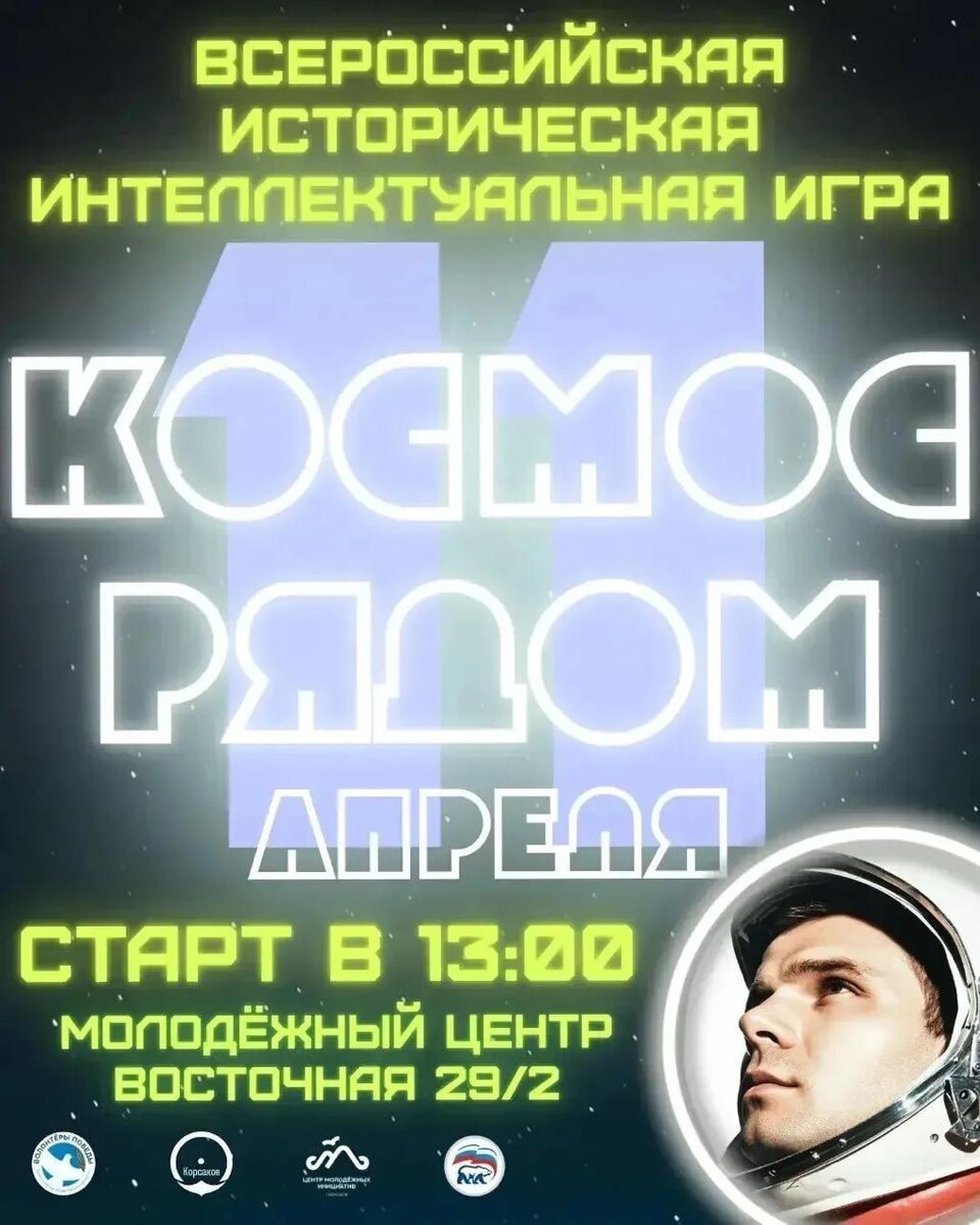 🚀11 апреля в преддверии Дня Космонавтики зовем вас на увлекательную Всероссийскую интеллектуальную игру «Космос рядом»!» 🌠Игра для ребят от 14 лет пройдет в молодежном центре по адресу: улица Восточная, 29/2 в 13:00. 🌍Хотите испытать свои знания о космосе? ⭐️Регистрируйтесь командой из четырех человек по ссылке: https://forms.yandex.ru/cloud/69c32ceb50569056fd18dd1f 🚀Количество команд ограничено, так что спешите! Это ваш шанс узнать больше о загадках Вселенной! Срок подачи заявок: до 10.04.2026 ⭐Информацию по мероприятию можете уточнить у организатора по номеру: + 7 914 548 74 98 (Антон Вдовин). 🧒Подписывайтесь на Мой Корсаков в MAX и будьте в курсе событий!