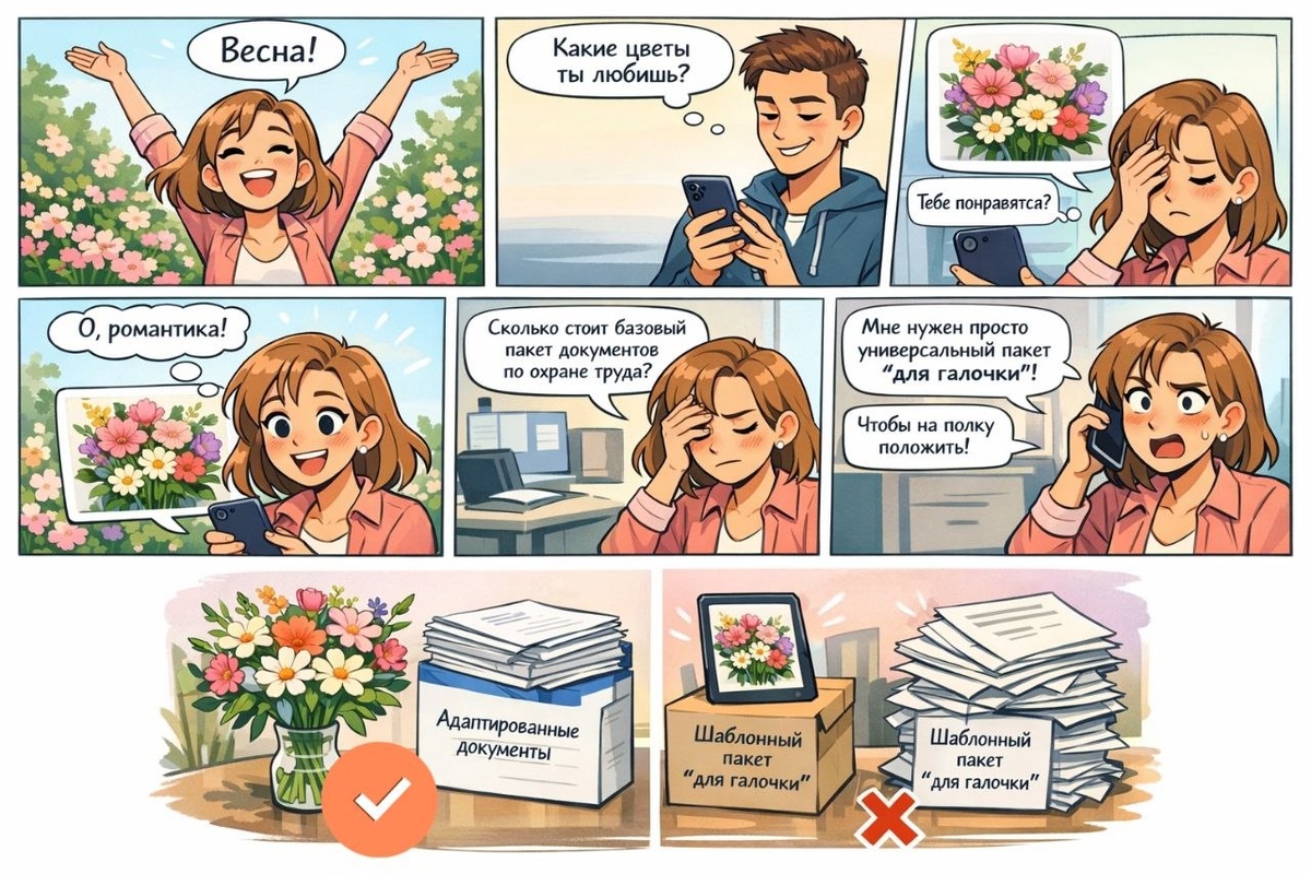 👀 Недавно встретились лицом к лицу с одной историей. Один парнишка студент проявлял интерес к юной девушке. И написал ей «Какие цветы ты любишь?», получил ответ с подробностями. Что было потом, как вы думаете?👀 - Он прислал девушке картинку-открытку с этими цветами🥸 Думаю, у нас тут достаточно взрослая и понимающая аудитория, и объяснять, как к такому относятся девочки, будет лишним.🫦 💥Какая связь с охраной труда? Было однажды такое: звонит руководитель фирмы, и спрашивает «Сколько у вас стоит разработать пакет документов по охране труда?». Разьясняем тарифы и оговариваем, что цена зависит от количества работников, видов выполняемых работ и т.д. и т.п. 🔍Этот работодатель говорит, что мы задаем много лишних вопросов, а ему нужен просто базовый по минимуму пакет документов по охране труда. Который он положит на полку и будет спокоен при проверке. 😢😭 ❌И после того, как мы начали обьяснять, что так неправильно и охрана труда так не работает, он говорит, что мы неправильные с