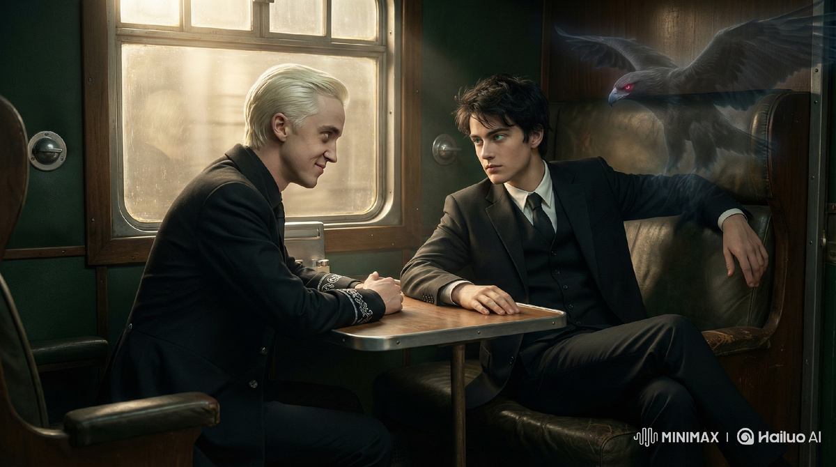 Поезд теперь стал тише, золотой свет вечера растянулся над холмами, когда Хогвартс-Экспресс начал свой последний отрезок пути к замку. Воздух внутри купе наполнился ощущением предвкушения — тем, что приходит перед переменами, перед судьбой.