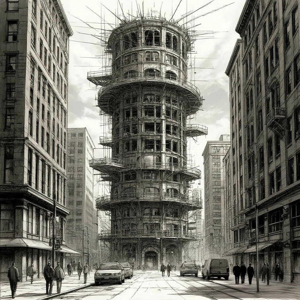 Воздух вокруг загустел. Мир дрогнул. Волков закрыл глаза, представляя башню во всех деталях: высоту, форму, часы с тринадцатью делениями. Когда он открыл их, перед ним возвышалась тёмная громада башни проекта «Часовой пик».