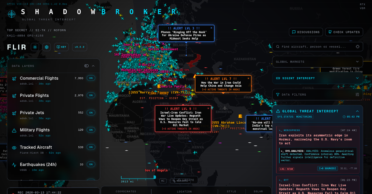 ShadowBroker — это OSINT-панель мониторинга в режиме реального времени, предназначенная для агрегирования широкого спектра информации в едином картографическом интерфейсе. Система непрерывно собирает и визуализирует актуальные данные, поступающие из множества открытых источников. В их число входят сети отслеживания воздушных судов, системы морской навигации, данные об орбитах спутников, службы мониторинга сейсмической активности, источники данных о конфликтах, мониторинг помех GPS и даже сети видеонаблюдения. Вся эта информация отображается на интерактивной карте мира, обновляемой в режиме реального времени.
