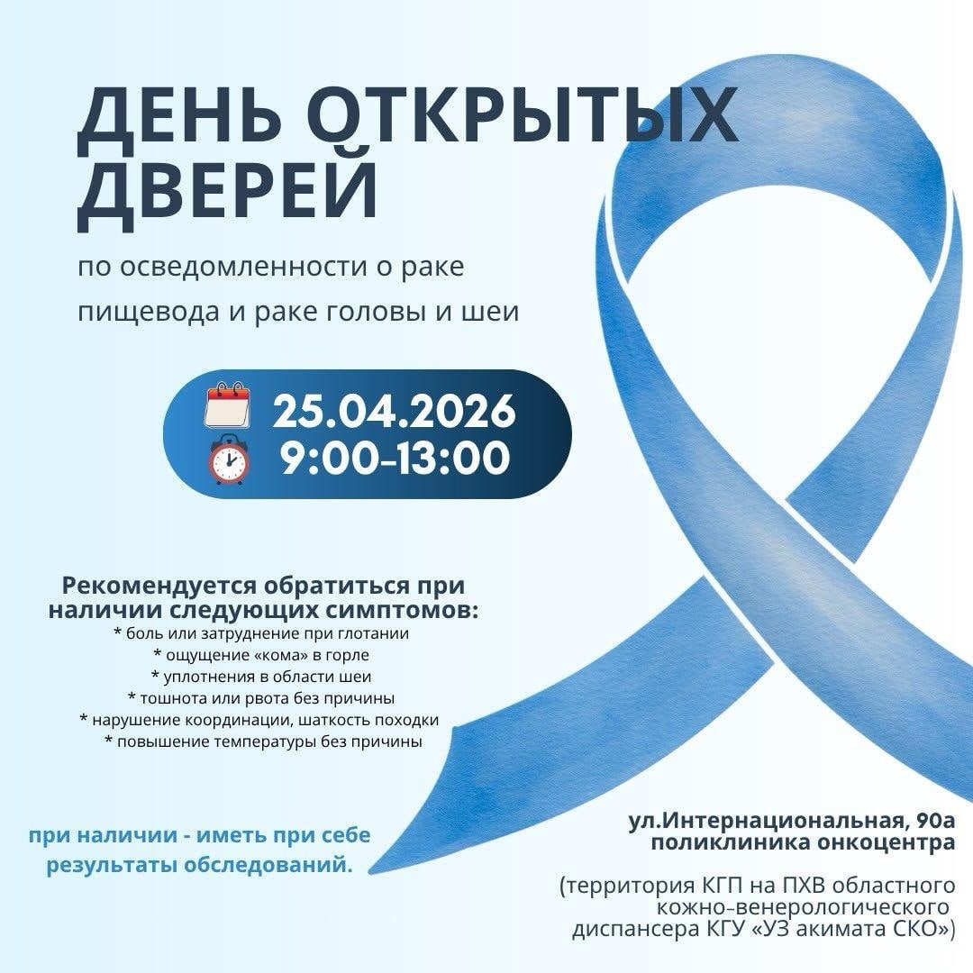 В Петропавловске 25 апреля пройдёт день открытых дверей в областном онкологическом центре. Североказахстанцы смогут прийти на приём и пройти обследование без записи и направлений, сообщает Петропавловск.news. В Петропавловске вновь пройдёт день открытых дверей в онкодиспансере — такие мероприятия уже стали доброй традицией и каждый раз собирают десятки жителей региона. Это возможность без записи и направлений попасть на приём к специалистам и пройти обследование. Как сообщили в медучреждении, очередной день открытых дверей состоится 25 апреля в рамках месячника по профилактике и повышению осведомлённости об онкологических заболеваниях. В этот раз приём будет посвящён раннему выявлению рака пищевода, а также онкологических заболеваний головы и шеи. Приём пациентов проведут с 9:00 до 13:00 по адресу: улица Интернациональная, 90А — на территории областного кожно-венерологического диспансера, куда временно переехала часть служб онкоцентра в связи с ремонтом. Подобные акции традиционно