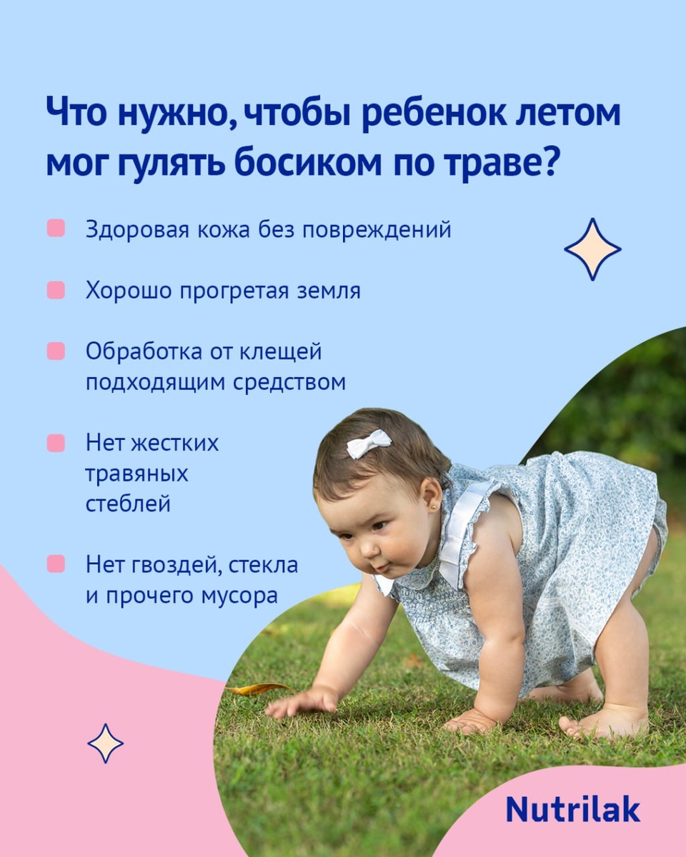 👶👶👶👶👶 Полезно ли ходить босиком по траве и земле? Понятно, что сейчас апрель, и вряд ли кто-то решит заниматься такими вещами в ближайшие дни. Однако потому и пишем сейчас, чтобы к маю, когда земля прогреется и покроется травой, вы были уже вооружены информацией. 🌴 Где и когда можно этим заниматься, чтобы польза была, а вреда не было? 🔹 Когда кожа на ногах – здоровая, без повреждений, царапин, опрелостей и т. п. Болезнетворные бактерии и яйца паразитов на траве, особенно если по ней бегают животные – вполне реальная штука. Через кожу они не проникнут, достаточно просто помыть ноги после прогулки. А вот в кровь через ранку – запросто 🔹 По теплой, прогретой земле, покрытой мягкой травой. Современные дети привыкли ходить или босиком, но по ровному и безопасному полу, или по улице, но в обуви. Поэтому кожа на ступнях достаточно тонкая и нежная, травмировать ее очень легко 🔹 В местах, которые обработаны от клещей, причем не чем попало, а средствами, не вредными для детей. И с