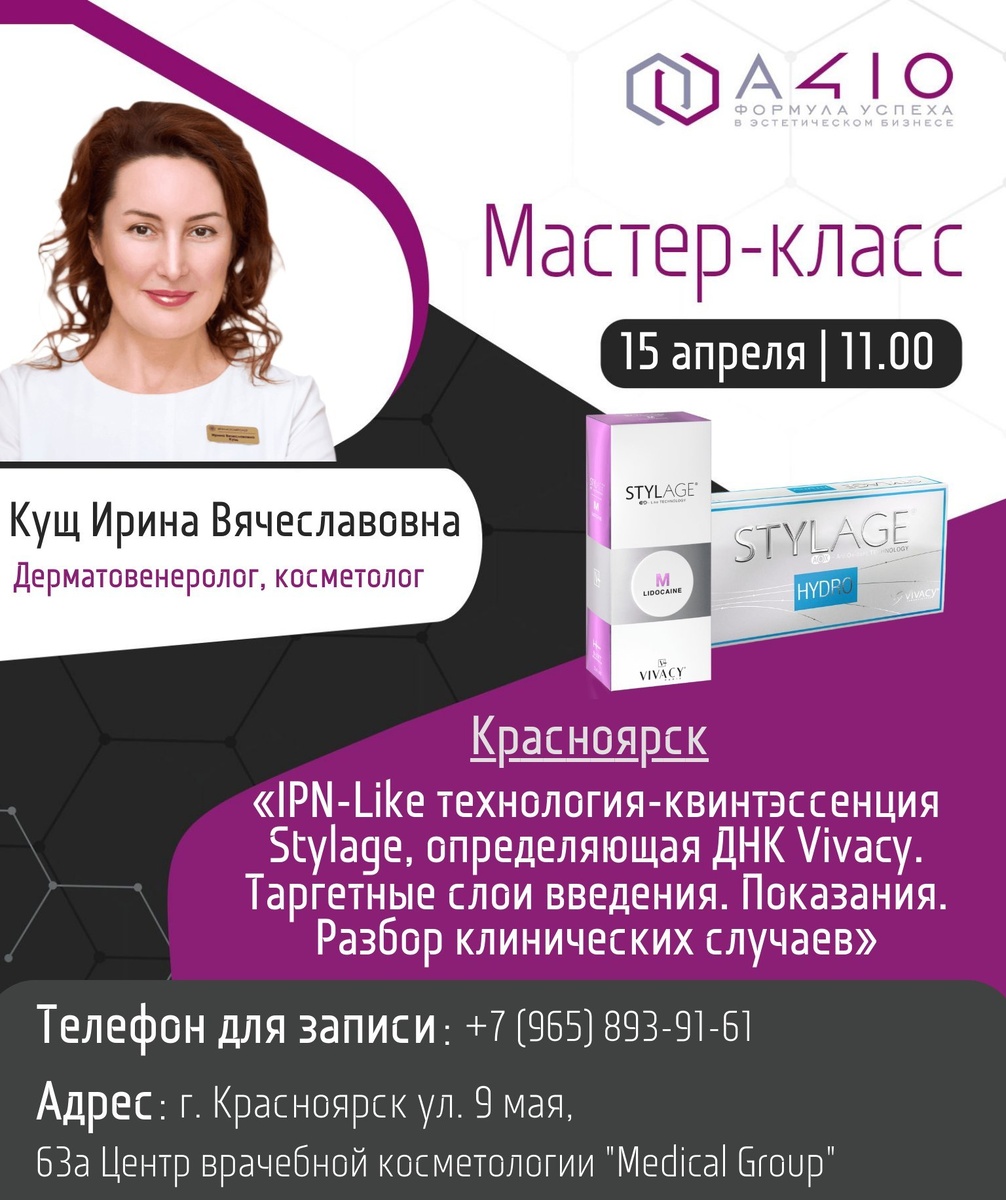 💟 Тема📖: «IPN-Like технология-квинтэссенция Stylage, определяющая ДНК Vivacy. Таргетные слои введения. Показания. Разбор клинических случаев» 📅 15 апреля ⏱️Время: 11:00 📍Место проведения: г. Красноярск ул. 9 мая 63а Центр врачебной косметологии "Medical Group". 👩⚕️Спикер: Кущ Ирина Вячеславовна—Дерматовенеролог, косметолог 📝 Программа: 11:00–13:00 Теоретическая часть🧠 13:00–13:30 Кофе-брейк☕️ 13:30–16:00 Практическая часть Условия участия уточняйте у менеджера✨ ⭐️Зарегистрироваться можно по номеру: +7 (965) 893-91-61📲 или на сайте: A410.ru ⭐️Для получения полного прайс-листа переходите по ссылке 👉🏻 http://clck.ru/38NMpp #Обучение_и_вебинары 📲 Мы в МАХ