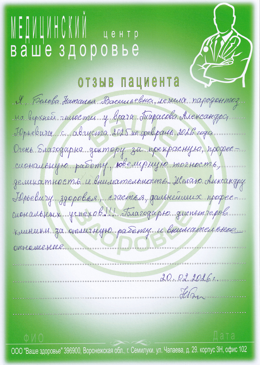 Я, Белова Наталья Васильевна, лечила пародонтоз на верхней челюсти у врача Тарасова Александра Юрьевича с августа 2025 по февраль 2026 года. Очень благодарна доктору за прекрасную, профессиональную работу, ювелирную точность, деликатность и внимательность. Желаю Александру Юрьевичу здоровья, счастья, дальнейших профессиональных успехов!!! Благодарю диспетчеров клиники за отличную работу и внимательное отношение. 20.02.2026 Все отзывы: стомвз.рф/reviews.html #стоматологиясемилуки #вашездоровье #стоматологияотзывы #отзывыстоматология #отзывпациента #семилуки #семилукилайф #семилукистоматология #семилукскийрайон #лечениезубов
