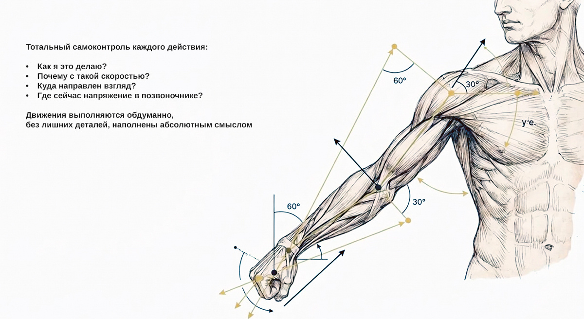 Но этого ещё недостаточно. Необходимо осуществлять контроль и управление не только над физическими действиями, их силой, траекторией и дистанцией, определяющих качество исполнения, но и над работой всех вспомогательных составляющих. Если это движение, то куда он движется и зачем. Только всё это вместе взятое является частью успеха любой динамики движения в целом, поскольку кроме этого необходимо управлять работой и тональностью — настроением своего сознания. Пожалуй, в такой работе это самое сложное, и без этого не может быть состояния осознания. Собственно говоря, это и есть состояние осознания, оказывающее на нас определяющее влияние в работе над собой.