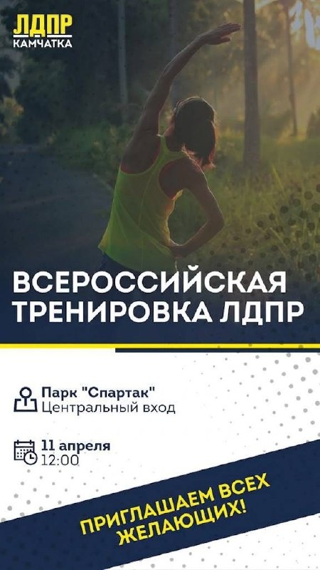 » В ближайшую субботу, 11 апреля, Камчатское региональное отделение ЛДПР приглашает всех жителей и гостей полуострова присоединиться к общегородской зарядке «Мне по силам». Мероприятие приурочено ко Всемирному дню здоровья и направлено на популяризацию активного образа жизни. Место проведения: г. Петропавловск-Камчатский, стадион «Спартак». Дата и время: 11 апреля (суббота) в 12:00. Тел. Для связи: 8-996-035-24-29 Мы ждем всех, кто хочет провести выходной с пользой, зарядиться энергией и провести время в кругу единомышленников. Возраст и уровень физической подготовки значения не имеют. Приходите сами и приводите друзей. Проведем этот день с пользой для здоровья! #ЛДПР #Камчатка #Спорт #ЗдоровыйОбразЖизни #МнеПоСилам #ДеньЗдоровья #ПетропавловскКамчатский #Регион41