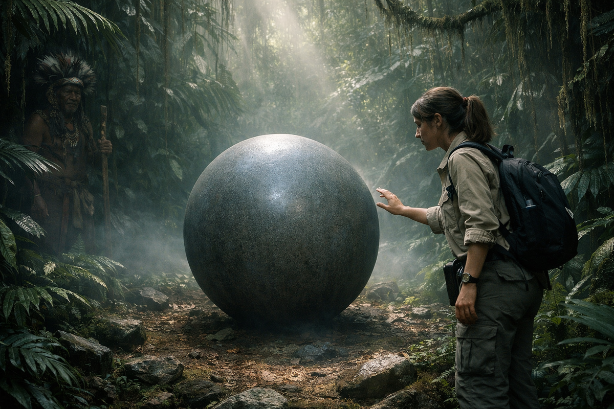 Сферу они увидели в просвете между деревьями — сначала просто тёмный округлый силуэт, потом, когда подошли ближе, полную форму. Метр двадцать в диаметре, идеально круглая, гранодиоритовая, серо-зелёная. Стояла в небольшой расчистке, будто лес намеренно отступил, давая ей пространство.