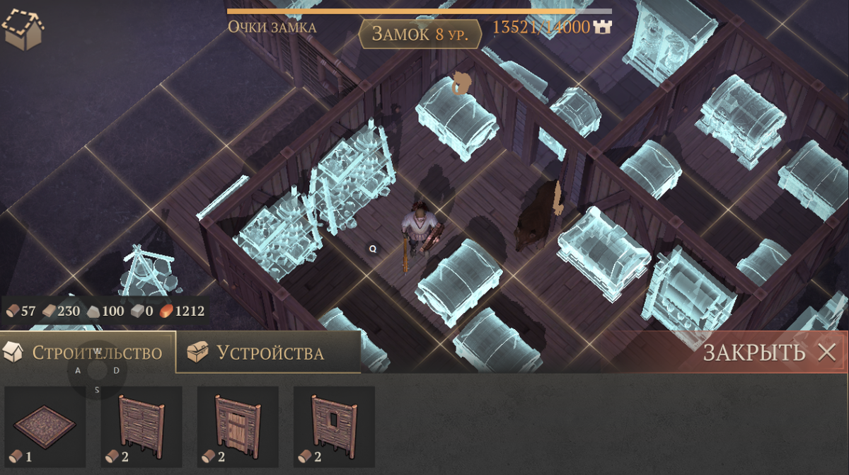 Дом, сараи, а впоследствии и замок с каменными стенами и тронными залом строятся в специальном режиме, войте в него можно, нажав на иконку башни в правом верхнем углу.
