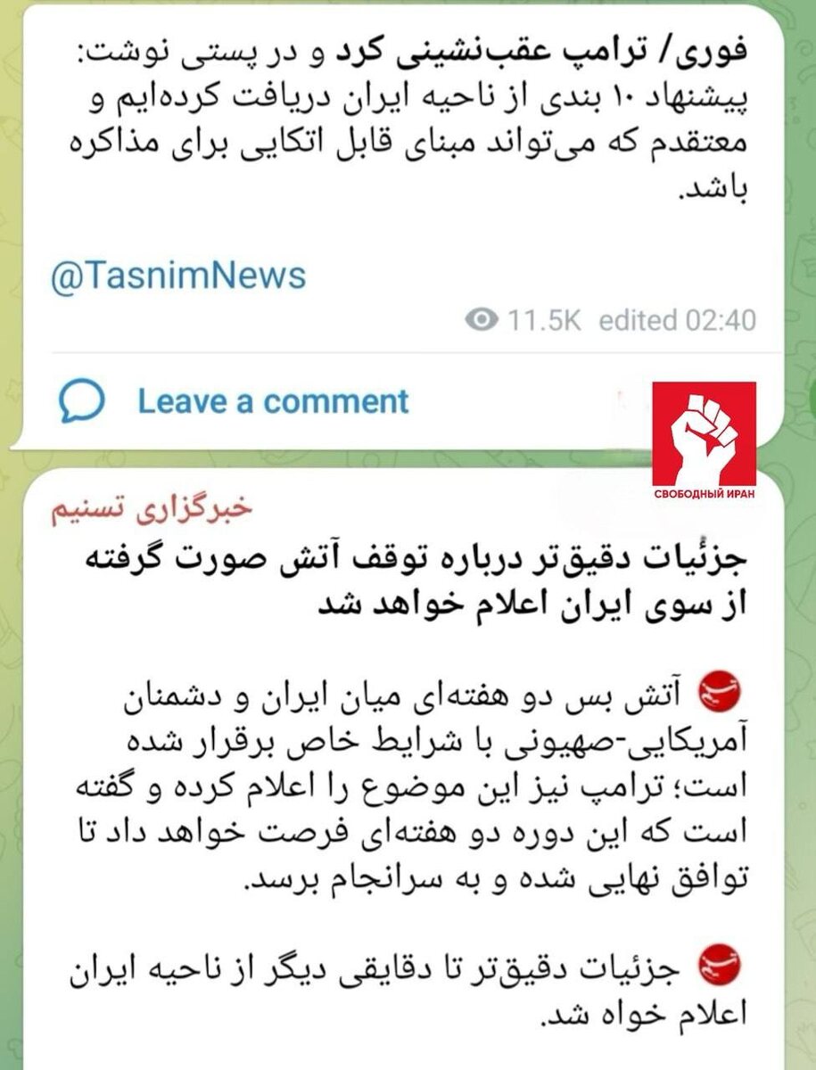 🛑 Иранские СМИ пишут о двухнедельном перемирии между Ираном и его американско-произраильскими противниками. Tasnim утверждает, что Трамп подтвердил паузу, а IRNA сообщает, что он также репостнул заявление Аббаса Арагчи о предложении Тегерана для переговоров. Подпишитесь на канал