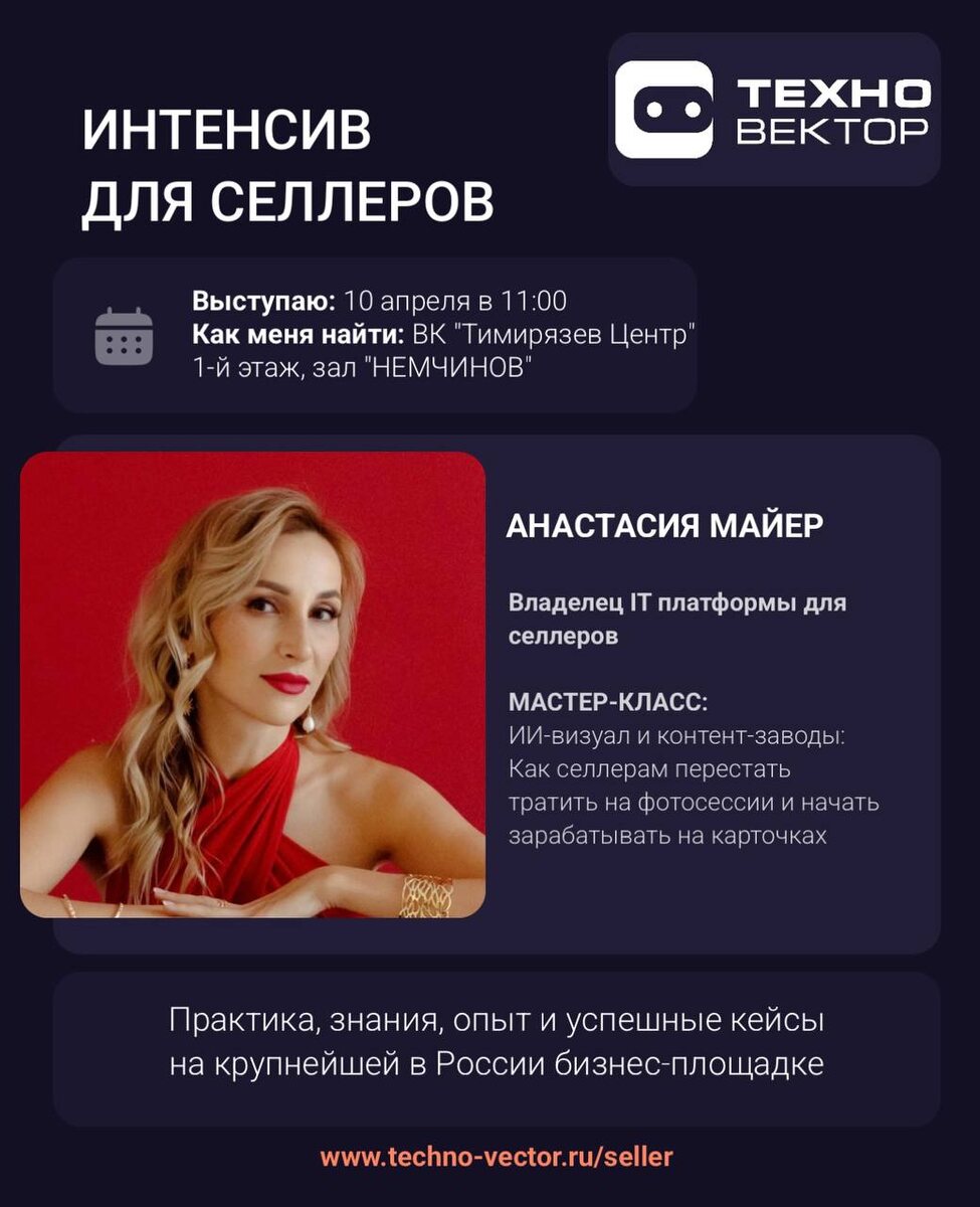 » Друзья, 10 апреля я буду спикером на бизнес-интенсиве для селлеров в рамках международной выставки информационных и коммуникационных технологий «СВЯЗЬ‑2026» (проводится с 1975 года!). Это ключевое отраслевое событие года: 🔹 16 000+ посетителей 🔹 500+ экспонентов 🔹 3 000+ делегатов Моя тема: ИИ-визуал и контент-заводы: Как селлерам перестать тратить на фотосессии и начать зарабатывать на карточках Для кого интенсив: • Действующие селлеры поставщиков • Начинающие селлеры • Маркетологи • Предприниматели в поиске ниши • Владельцы офлайн Где и когда: 📍 Москва, ВК «Тимирязев Центр» Верхняя аллея, 6с1, центральный вход, 1-й этаж, зал «НЕМЧИНОВ», Малый конференц-зал 📅 10 апреля, пятница, 11:00 Регистрация на интенсив (вход свободный): 👉 https://techno-vector.ru/seller Приходите, будет полезно и актуально для всех, кто работает с маркетплейсами или только планирует начать. Буду рада увидеться и ответить на вопросы!