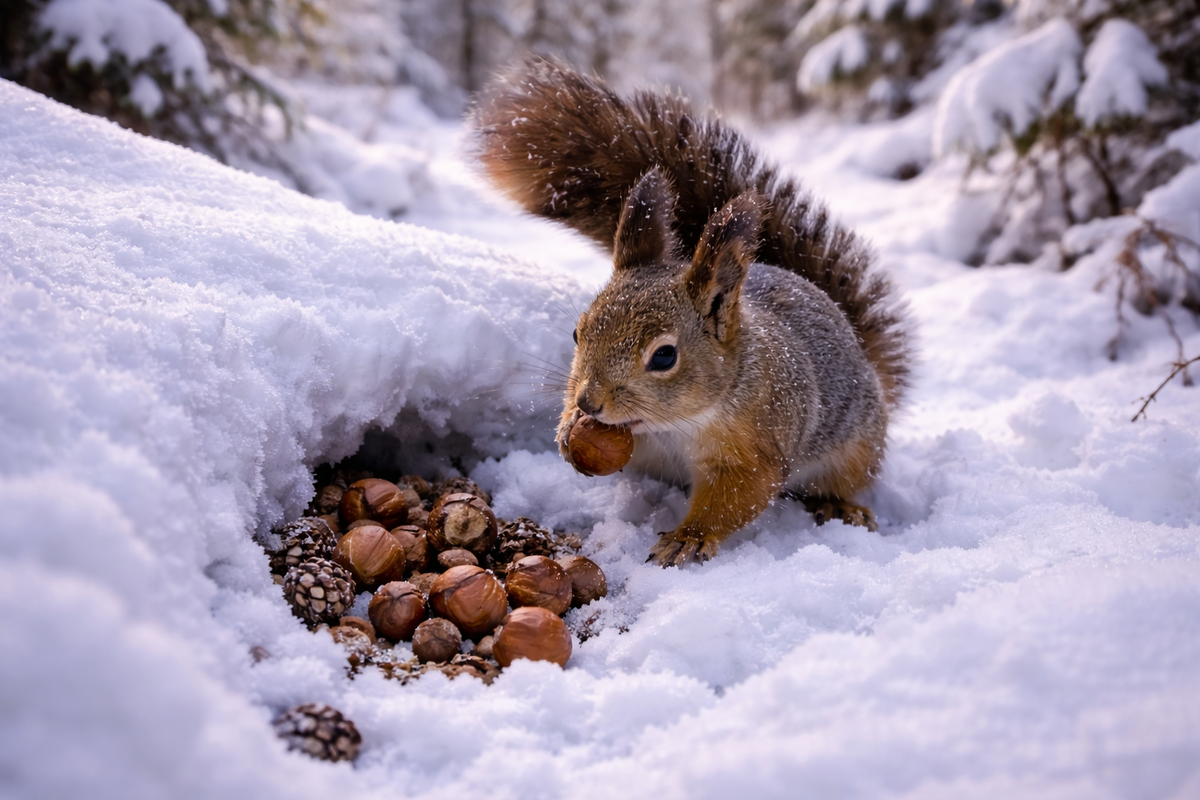 С первыми морозами жизнь в тайге не замирает — она меняет ритм. Там, где крупные звери сокращают движения, а многие виды переходят в состояние почти полной экономии, белка остаётся активной. Её день зимой — это постоянный поиск, проверка, запоминание и движение между точками, которые она сама же и создала ещё осенью. Запасы — основа её выживания. Ещё до снега белка прячет шишки, орехи, грибы, иногда даже кусочки коры в десятках и сотнях небольших тайников. Она не складывает всё в одно место. Напротив, распределяет корм по территории, создавая сеть запасов, разбросанных на разном расстоянии от гнезда. Когда снег ложится плотным слоем, эти тайники оказываются скрыты. Но для белки они не исчезают. Её память работает не как точная карта с координатами, а как система ориентиров. Она запоминает не точку, а место в контексте: дерево с характерным изгибом, поваленный ствол, расстояние до соседних ориентиров. Зимним утром белка выходит из гнезда — гайна, устроенного высоко в кроне. Там теплее,