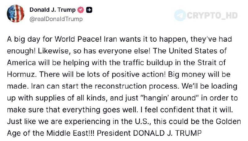 ! Иран хочет, чтобы все это закончилось, с них хватит! Как и со всех остальных! США помогут разгрузить ситуацию в Ормузском проливе. Ожидается много позитивных действий. Речь идет и о серьезных деньгах. Иран сможет начать восстановление. Мы будем поставлять необходимые ресурсы и находиться рядом, чтобы все прошло успешно. Я уверен, что так и будет. Как сейчас в США, это может стать «золотым веком» Ближнего Востока. Ранее: - «официальное заявление Ирана» - согласие Трампа - переговоры в пятницу Crypto Headlines