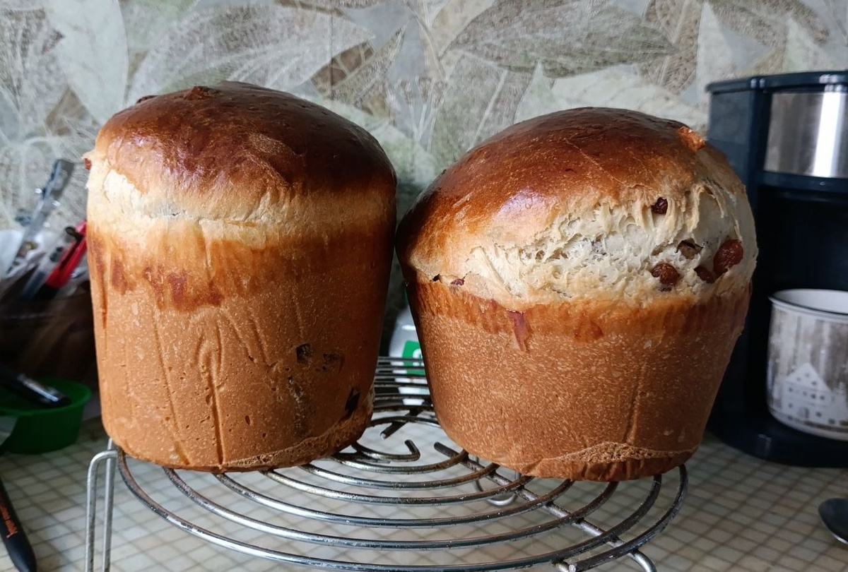 Пробный запек куличей на закваске 100% влажности. По сахару на мой вкус отлично! Тесто слоистое, слегка влажноватое. Все, как я люблю!