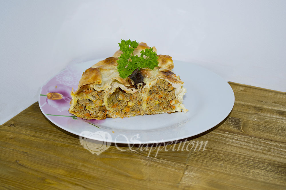 Для начинки на мясорубке перекручиваем мясо и морковь. Добавляем соль и специи по вкусу. Разогреваем сковороду с растительным маслом. Отправляем фарш в сковороду. Обжариваем до побеления мяса. На один лист лаваша выкладываем половину остывшей начинки. Сворачиваем рулетом, а затем в улитку. Выкладываем на середину формы для выпечки. На второй лист лаваша выкладываем вторую половину н