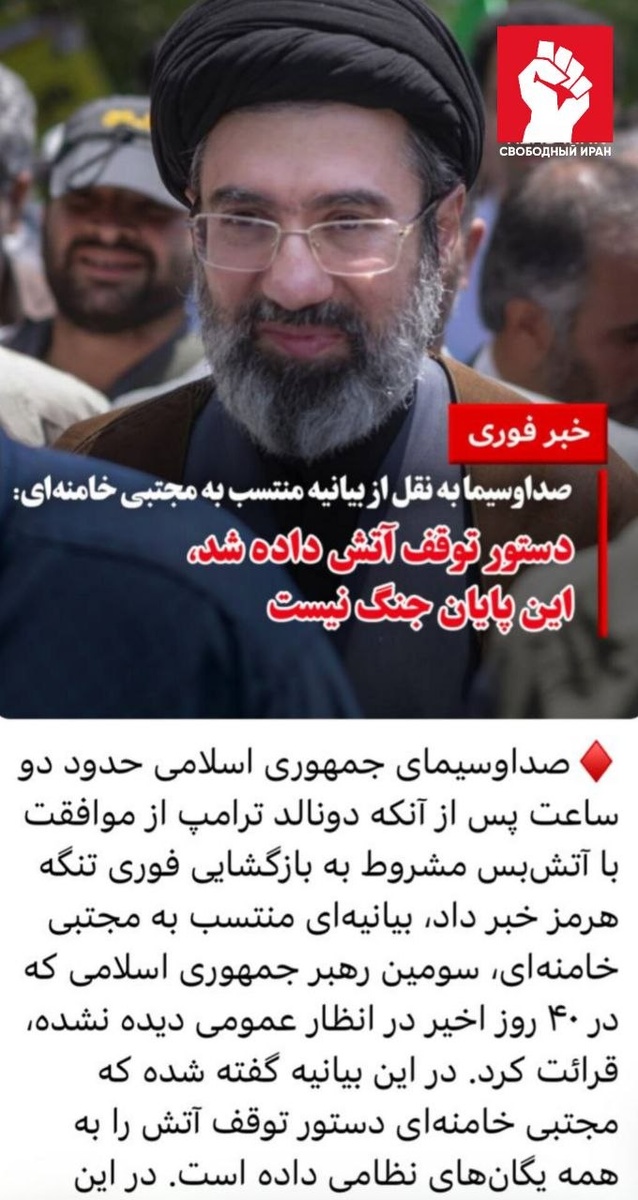 📺 Иранское гостелевидение транслировало заявление о том, что Моджтаба Хаменеи распорядился прекратить огонь: приказ уже разослали по всем воинским частям, и военные структуры обязаны его выполнить. Это случилось примерно через два часа после заявления Дональда Трампа о возможном перемирии. Отдельно отмечается, что Хаменеи не появлялся на публике 40 дней. The Times ранее писала со ссылкой на разведданные, что он находится в тяжелом состоянии в Куме, в коме и с ограниченными возможностями принимать решения. Подпишитесь на канал
