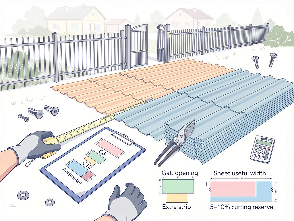 подрезку. Я покажу, как это сделать правильно, чтобы не переплатить и не бегать потом за добором. Запас в 5–10% спасает от простоев: под углы, ветер, неровности столбов всегда уйдёт лишний кусок листа. Начните с замера. Пройдитесь по контуру, где встанет забор. Для прямоугольного участка периметр P — это сумма длин сторон, умноженная на два. Пример: сторона А — 25 метров, сторона Б — 40 метров. Итого P = (25 + 40) × 2 = 130 метров. Вычтите ширину ворот и калитки — там профнастил не нужен. Допустим, ворота 4 метра, калитка 1 метр. Получается рабочая длина: 130 - 5 = 125 метров. Если участок не прямоугольный, меряйте по частям: прямые отрезки, повороты отдельно. На практике один угол может съесть пол-листа на подгонку. Для заборов берут марки С8, С10, С20. Полезная