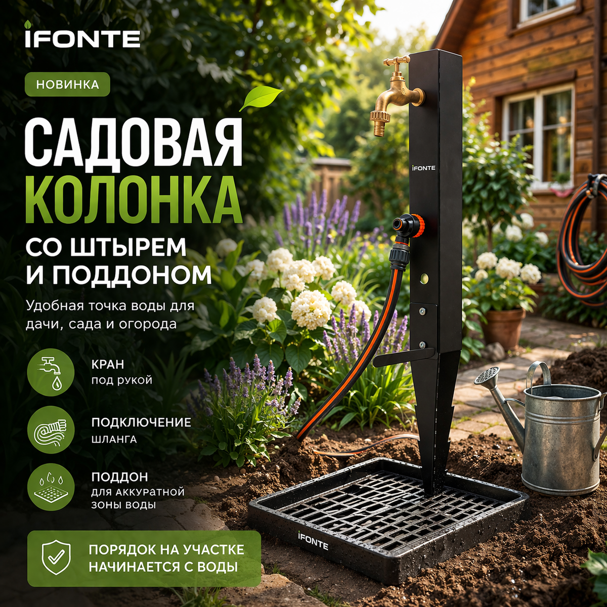 Садовая колонка со штырем и поддоном iFONTE — удобная точка воды для дачи, сада и огорода Когда вода на участке нужна не “где-нибудь”, а именно там, где вы работаете, поливаете, моете руки или наполняете лейку, особенно ценятся простые и продуманные решения. Садовая колонка iFONTE со штырем и поддоном помогает быстро организовать удобную точку воды на участке без лишней суеты. Что в ней особенно удобно: — штырь для установки в грунт — можно быстро разместить колонку там, где это нужно именно сейчас