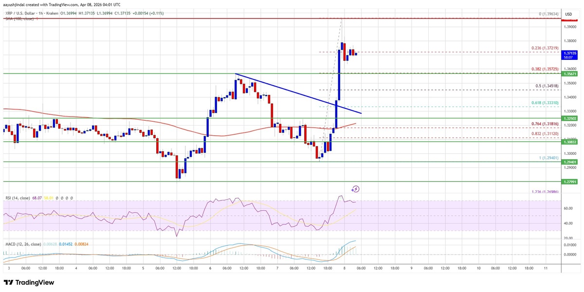 ? Цена XRP демонстрирует уверенный рост, преодолев отметку $1.3650, и сейчас консолидирует свои позиции, нацеливаясь на преодоление ключевого сопротивления в районе $1.40. Текущая динамика указывает на возможное продолжение восходящего движения, однако дальнейший рост будет зависеть от успешного закрепления выше этой отметки. 📊 Ключевые моменты: - XRP восстановился выше $1.3550 и 100-часовой скользящей средней. - Пробит медвежий тренд с сопротивлением на уровне $1.3350. - Сформирован максимум на уровне $1.3963. - Основные уровни сопротивления: $1.3880, $1.40, $1.4250, $1.4450, $1.4650. - Основные уровни поддержки: $1.3575, $1.3330, $1.3080, $1.3020, $1.2880, $1.2750. - RSI выше 50, MACD теряет импульс в бычьей зоне.