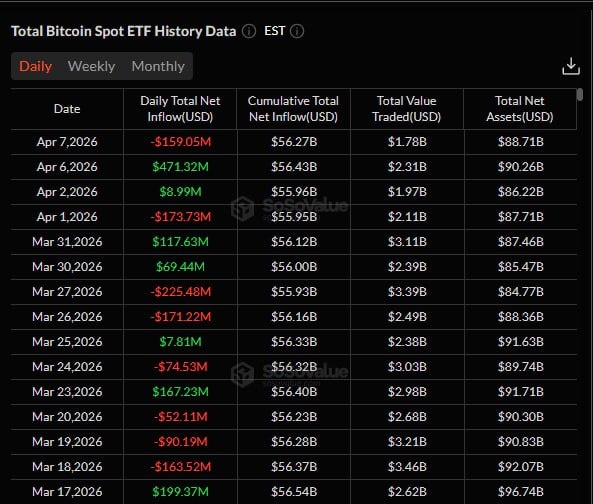 πΈΠΠΎ Π΄Π°Π½Π½ΡΠΌ SoSoValue, 7 Π°ΠΏΡΠ΅Π»Ρ ΡΠΏΠΎΡΠΎΠ²ΡΠ΅ Π±ΠΈΡΠΊΠΎΠΈΠ½-ETF Π·Π°ΡΠΈΠΊΡΠΈΡΠΎΠ²Π°Π»ΠΈ ΠΎΠ±ΡΠΈΠΉ ΡΠΈΡΡΡΠΉ ΠΎΡΡΠΎΠΊ Π² ΡΠ°Π·ΠΌΠ΅ΡΠ΅ $159 ΠΌΠ»Π½, Π° ΡΠΎ ΡΠΏΠΎΡΠΎΠ²ΡΠ΅ ETF Π½Π° ΡΡΠΈΡΠΈΡΠΌ