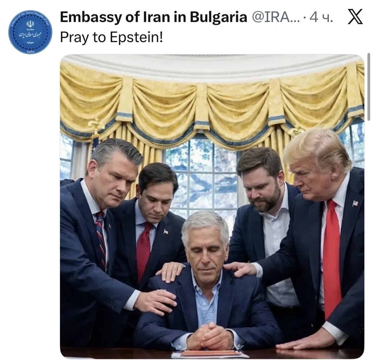 Когда посольство Ирана разместило этот мем, с предложением коалиции "помолиться Эпштейну", иранские же ракеты наносили очередную серию ударов по связанной с США инфраструктуре в странах Ближнего Востока. А премьер Пакистана (страны в списке основных угроз/врагов США, наряду с КНР и Россией) заявлял о достижении соглашения двухнедельного перемирия.