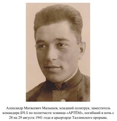 Младший политрук Александр Матвеевич Малышев, заместитель командира БЧ-5 по политической части, появился на «Артёме» 4 июля 1940 года. Ему было двадцать восемь лет. За его плечами были Ленинград, Лесной техникум, работа на Невском машиностроительном заводе, служба в бригаде торпедных катеров, редакторство в многотиражной газете. В партию он вступил в 1939 году – незадолго до того, как флотская судьба свела его с этим кораблём.