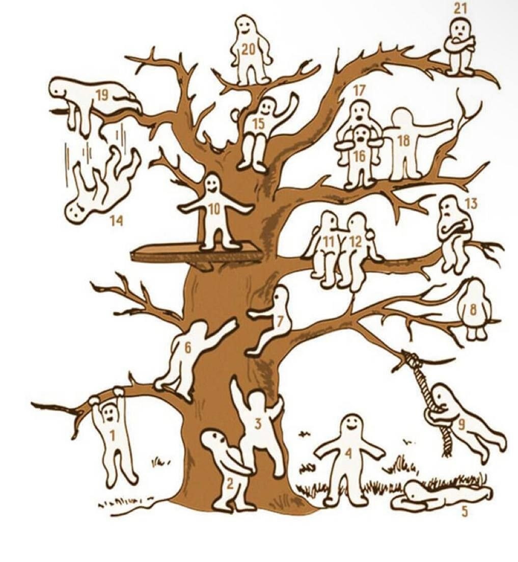Есть рисунок дерева. На нем человечки на разной высоте и в разных позах. Надо найти такого, которой вызывает стойкие ассоциации с собой. В текущий момент времени, конечно. Смотрим картинку. Думаем и выбираем. Где Вы на этом дереве? Расшифровку пришлю вечером! #АннаК_тест