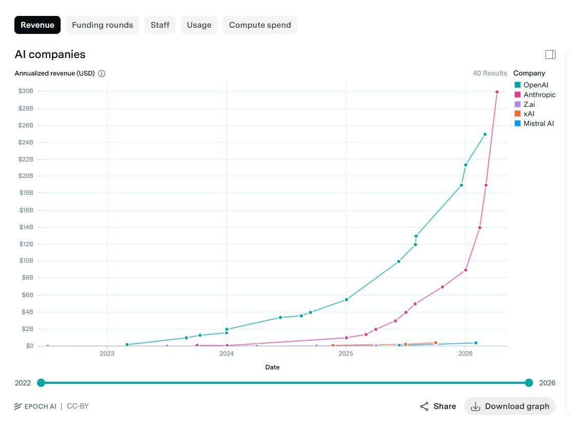Сегодня создатели Claude отчитались о $30 млрд/год. У OpenAI по последним данным ~$25 млрд/год. Свежих цифр пока нет, но судя по всему теперь они отстают от конкурента. Ещё в конце позапрошлого года у Anthropic темпы выручки были в 30 раз меньше. Намечается большая гонка.
