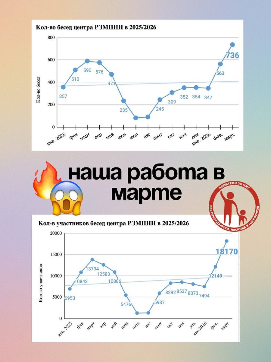 ! 🎉 😱 Мы рады поделиться впечатляющими результатами — таких у нас ещё не было: 👍 В марте прошло 736 бесед в онлайн и офлайн форматах (для сравнения: в феврале — 565). 👍 Наши мероприятия посетили 18 170 слушателей. Мы невероятно гордимся нашими специалистами и благодарим их за профессионализм и преданность делу. Особая благодарность нашим спонсорам — без вашей поддержки эти беседы просто не состоялись бы. Также нам очень приятно видеть взрослых, заинтересованных в проведении бесед! Наша миссия — помогать подросткам выбирать правильные жизненные ориентиры. И мы продолжаем этот путь с той же энергией и преданностью. 💪 Принимаем поздравления - 🔥