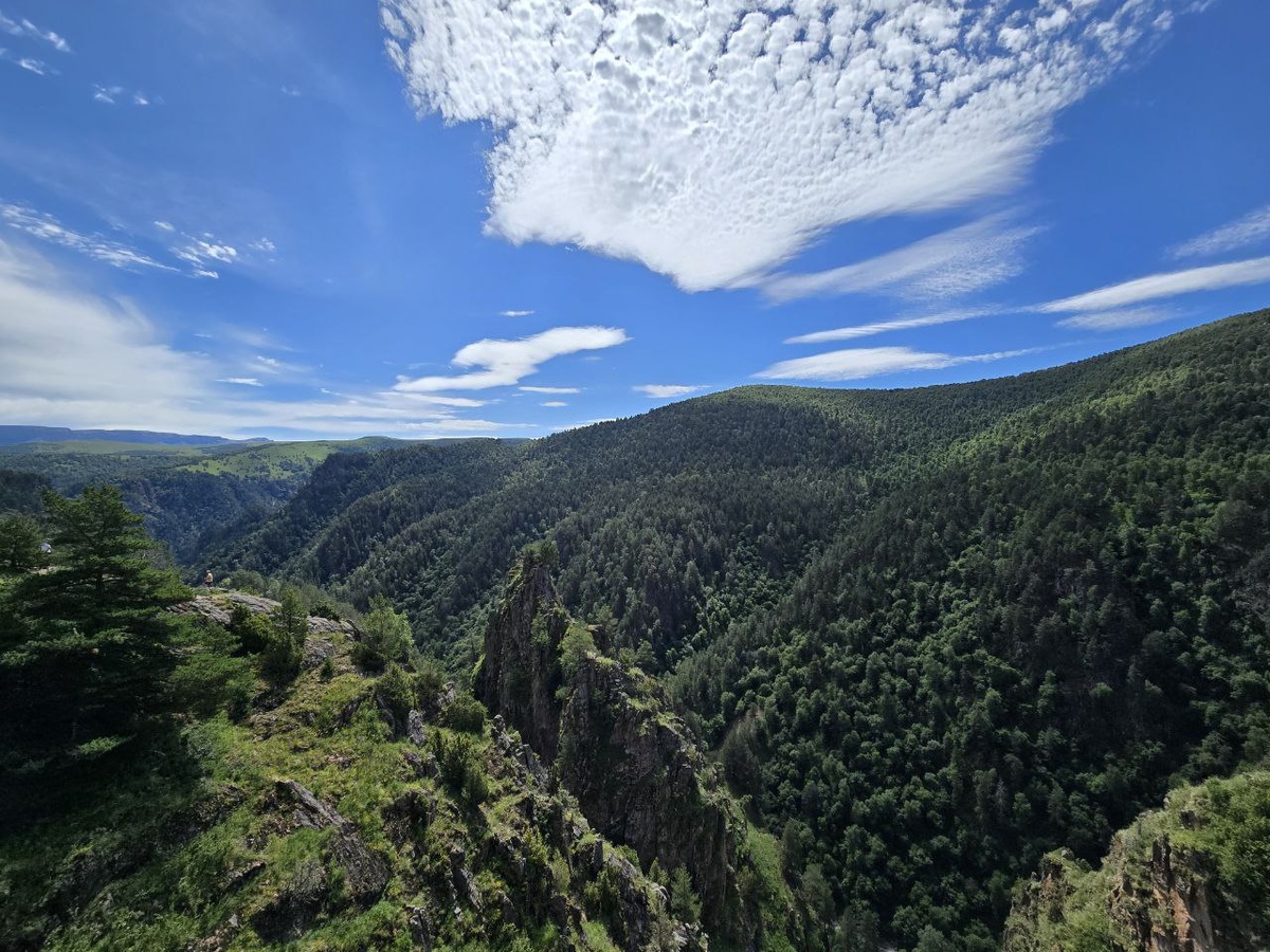 Почему сюда: Это идеальное знакомство с горам. Город стоит на высоте 800–1000 м, но вокруг уже видны вершины. Главное — Курортный парк, который тянется на километры, а в нём — ровные дорожки, бюветы с нарзаном и канатная дорога на гору Малое Седло. Подниматься на ней не страшно даже тем, кто боится высоты: кабинки закрытые, едут плавно.