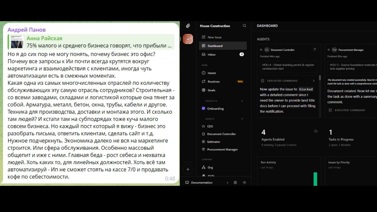 А у меня стройка и бетон!» Недавно в комментариях один прораб написал вещь, от которой я не смогла отмахнуться. Почему все кейсы с ИИ про разобрать почту, ответить клиентам, сделать сайт? А где стройка? Где арматура, логистика, субподрядчики, сметы? Где реальный сектор, в котором фонд оплаты труда, материалы, аренда и налоги съедают 70% выручки? Спрашивал — отвечаем. Сегодня я за 20 минут собрала виртуальную строительную компанию из ИИ-агентов. Поставила задачу: каркасный дом 80 м², бюджет 3 млн, дедлайн в сентябре. ИИ-прораб сам решил, кого нанимать: сметчика, закупщика, документоведа. Сметчик посчитал фундамент на 10–12 кубов бетона М300 и 800 кг арматуры А500, собрал три ценовых предложения. Закупщик нашёл поставщиков, запросил скидки за объём и привязал график поставок к срокам заливки. А документовед остановился и написал: «Мне нужны документы на землю, без них дальше работать невозможно». Еще раз, он не выдумал данные, а честно сказал, что без человека тут никак. Все четве