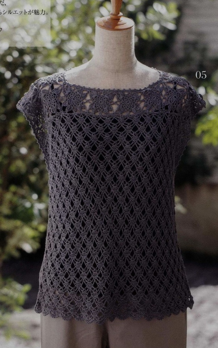 При этом, если использовать эти качества в качественной пряже актуальных цветов и оттенков, то вещи могут заиграть более интересно и заманчиво. Этот топик тоже прост в исполнении, но в нём, как и во многих изделиях от японских мастеров, используются три вида узоров - основное полотно вяжется сплошным ажурным узором, кокетка собрана из мотивов и тонкое кружево... обвязка по низу - как завершающий этап. которая выступает ярким акцентом этой вещи в бежевом цвете. связанный крючком в технике печворк, из пряжи в нежных бирюзовых тонах украсит и преобразит образ.