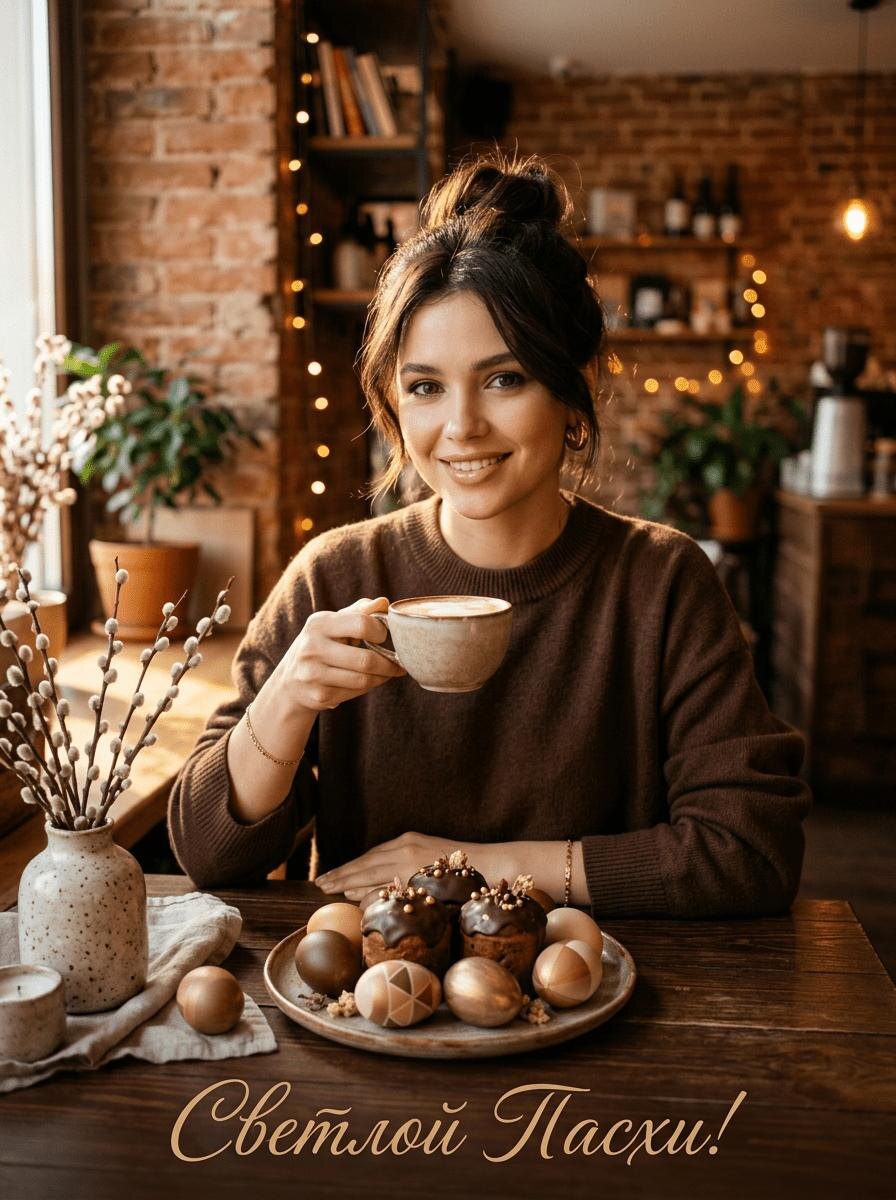Сгенерировать фото⚡️ Промтсы сайт🖼 Используй лицо девушки с загруженного фото. Праздничная пасхальная открытка. Кинематографичный портрет, крупный план девушки по пояс. Лицо строго соответствует референсу — все черты сохранены без изменений. Тёмные волосы собраны в небрежный пучок, несколько локонов спадают на лицо. Макияж: натуральный, с лёгким смоки-айс, губы с нюдовым блеском. Девушка сидит за столом в уютной кофейне с кирпичными стенами, одета в шоколадно-коричневый свитер оверсайз из мягкой кашемира. Перед ней — деревянный стол, на котором стоит чашка с кофе, тарелка с мини-куличами с шоколадной глазурью и золотым драже, яйца в кофейных, бежевых и золотых тонах с геометрическим орнаментом, ветки вербы в керамической вазе. Девушка держит в руке чашку кофе, её взгляд направлен в камеру с мягкой улыбкой. Освещение: тёплое, утреннее, с длинными тенями и золотистыми бликами. Внизу кадра — надпись «Светлой Пасхи!»(на русском языке) шоколадно-золотистой каллиграфией. Качество: ultra de