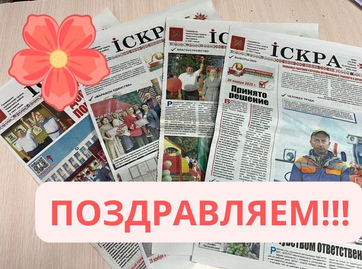 ! 🗞Почти век ваше издание служит надежным хроникером жизни Чаусского района — от первых страниц под названием «Калгасны сцяг» в 1931 году до сегодняшней «Іскры». ✨Мы восхищаемся стойкостью и преданностью делу ваших предшественников: газета выходила даже в военные годы, печатала сводки Совинформбюро, письма с фронта и исторический номер с обращением Сталина в честь Победы. В послевоенные годы ваша газета не просто информировала, а объединяла людей, помогала восстанавливать разрушенное войной хозяйство и строить будущее. 📌Сегодня ваша газета остается востребованной и современной, освещая все грани жизни района. 👏От всей души желаем коллективу «Іскры» крепкого здоровья, неиссякаемого вдохновения, ярких публикаций, благодарных читателей и новых творческих достижений! Пусть газета и впредь остается верным другом и надежным источником информации для каждого жителя Чаусского района!