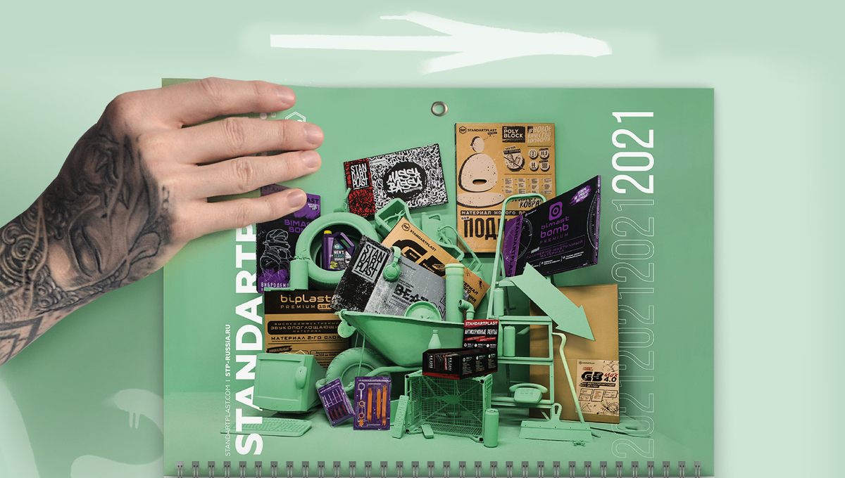 Сегодня в дизайне все говорят о нейросетях, генерации и идеальных 3D-моделях. А я вспоминаю проект Standartplast, который делала ещё в 2020 году, буквально за год до того, как AI стал мейнстримом. Ознакомиться с проектом Behance: Корпоративный календарь Standartplast Мы закупили краску, кисти, валики. И начали красить ВСЁ. Столы, стулья, бутылки, колеса, декорации — всё, что попадало в кадр, должно было стать зеленым. Одинаковым зелёным. Звучит просто, а на деле куча экспериментов. Краска на дереве ложится иначе, чем на резине. На пластике иначе, чем на бумаге. Она сохнет, меняет тон, даёт блики. Мы пробовали, перекрашивали, ждали, снова пробовали. Продукты Standartplast на фотографиях остались единственным ярким элементом на зелёном фоне. Идея: главное - живой продукт, всё остальное просто фон. Композицию строили на контрасте: крупное и мелкое, диагонали вместо скучных рядов, воздух между объектами и чёткий главный герой в каждом кадре. Зелёный фон не просто цвет, а инструмент, он с