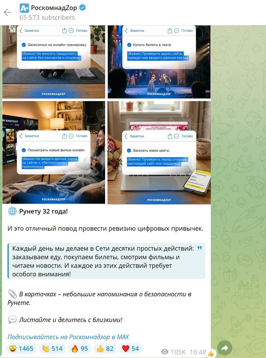 «Рунету 32 года! И это отличный повод провести ревизию цифровых привычек. Каждый день мы делаем в Сети десятки простых действий: заказываем еду, покупаем билеты, смотрим фильмы и читаем новости. И каждое из этих действий требует особого внимания!», – говорится в сообщении ведомства. В иллюстрациях к посту РКН привел несколько советов по цифровой безопасности. День рождения Рунета отмечается 7 апреля. В этот день в 1994 году в международный национальный доменный перечень InterNIC внесли домен .ru. Читать нас можно и в MAX