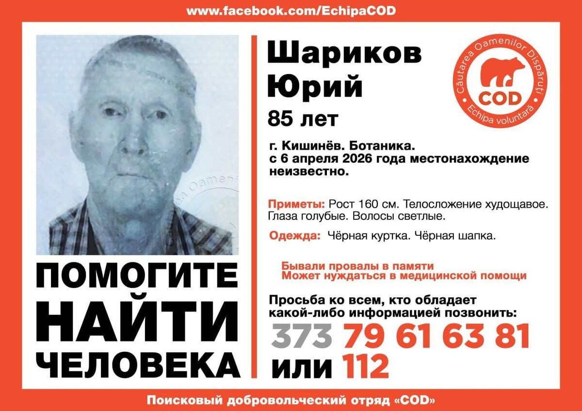 ! Мужчина из Кишинева, 85 лет, с 6 апреля его местонахождение неизвестно. Просьба ко всем, кто видел Юрия или обладает какой-либо информацией, позвонить по телефону 079616381 или 112. @eNewsmd.online 👈 Подписывайтесь на наш канал