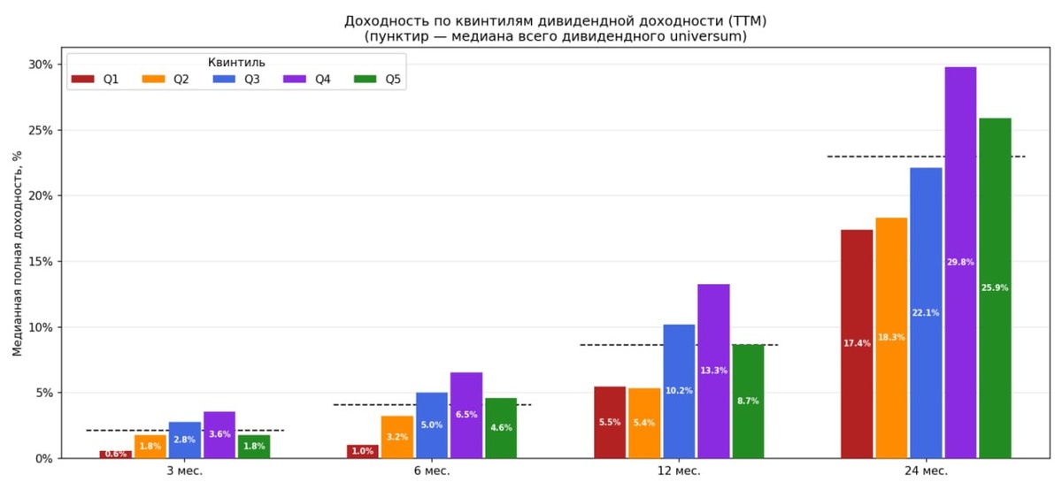 Я проверил 124 акции MOEX: дивиденды в 9% обгоняют 15% Я был уверен: чем выше дивидендная доходность — тем лучше будущий результат. Ilya Chernov проверил на 124 акциях MOEX за 16 лет. Оказалось, зависимость немонотонная — и это меняет подход к выбору дивидендных бумаг. 👉Что тестировал Для каждой пары (акция, месяц) я вычислял скользящую дивидендную доходность за предыдущие 12 месяцев: сумма выплаченных дивидендов делённая на цену. Затем разбивал все акции на 5 квинтилей по этому показателю внутри каждого месяца и считал медианную полную доходность (с реинвестированием дивидендов) на горизонтах 3, 6, 12 и 24 месяца. Всего 10 375 наблюдений, 2010–2026. Тест значимости — Mann-Whitney U. 👉Результат: Q4, а не Q5, — лучший квинтиль На горизонте 12 месяцев медианная доходность по квинтилям: ▪️Q1 (yield ~1.2%): +5.5% ▪️Q2 (yield ~3.8%): +5.4% ▪️Q3 (yield ~6.5%): +10.2% ▪️Q4 (yield ~9.0%): +13.3% — лучший результат ▪️Q5 (yield ~15.5%): +8.7% — хуже Q4 и почти равен базовому уровню (+8.6%)