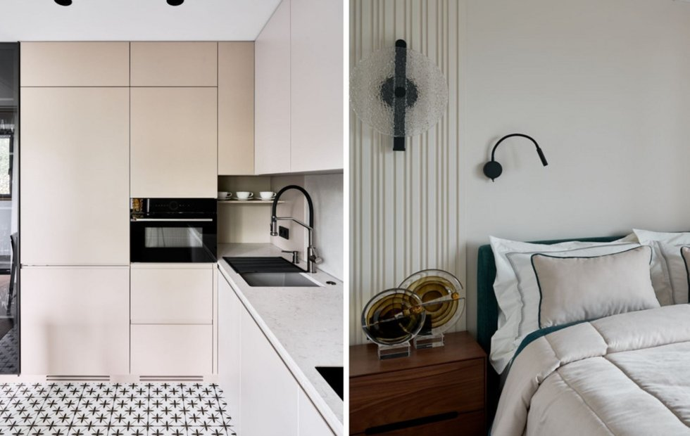 Для защиты стен в комнатах и одновременного декора использованы вертикальные реечные панели. Они создают легкий ритм и интересную игру света и тени, не перегружая пространство. В спальне классические молдинги расположили в современной интерпретации, добавив стенам рельефа и глубины.