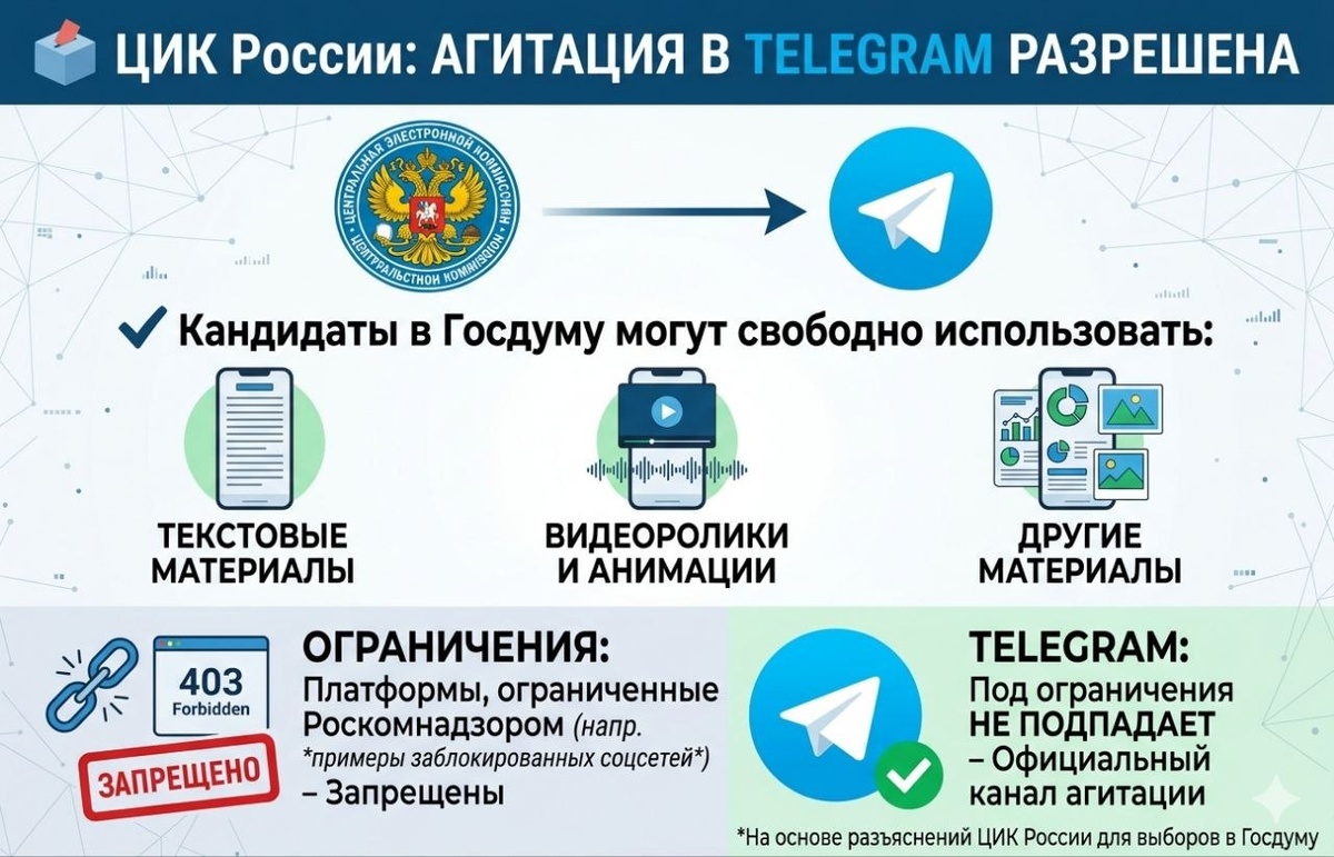 ЦИК России разъяснил правила: кандидаты на выборах в Госдуму могут свободно использовать ресурсы платформы Telegram для предвыборной агитации, включая публикацию текстов, видео и фото. Ограничения касаются только платформ, доступ к которым уже ограничен Роскомнадзором. При этом Telegram под эти ограничения якобы не подпадает — значит, мессенджер официально остаётся доступным каналом для агитации. 🤩 PRO: история продолжается