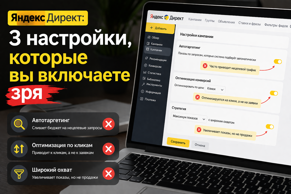 Вы запустили рекламу. Вроде всё сделали как учили. А заявок нет. Бюджет улетает. В 70% случаев причина не в «плохом трафике», а в настройках, которые вы включили автоматически или по привычке. Их задача — тратить ваши деньги, а не приносить клиентов. Давайте разберём три самые опасные настройки. Выключите их — и увидите разницу. Я проанализировала 20 проектов за последние полгода. При бюджете 100 000 ₽ в месяц вы теряете 50 000–70 000 ₽. Просто потому, что включили три галочки. Это галочка в мастере кампании — «показывать объявления в РСЯ» (рекламная сеть Яндекса). Что это значит: вашу рекламу увидят не только в поиске, но и на сайтах-партнёрах: новостных порталах, форумах, играх. Звучит как «больше охвата». На деле — 90% кликов с этих сайтов не покупают. Они случайно тыкнули, читали новость, отвлеклись. Что делать: создайте отдельную кампанию для РСЯ. Не смешивайте с поиском. И дайте ей отдельный маленький бюджет на тест. А в поисковой кампании уберите эту галочку. Когда вы создаёте