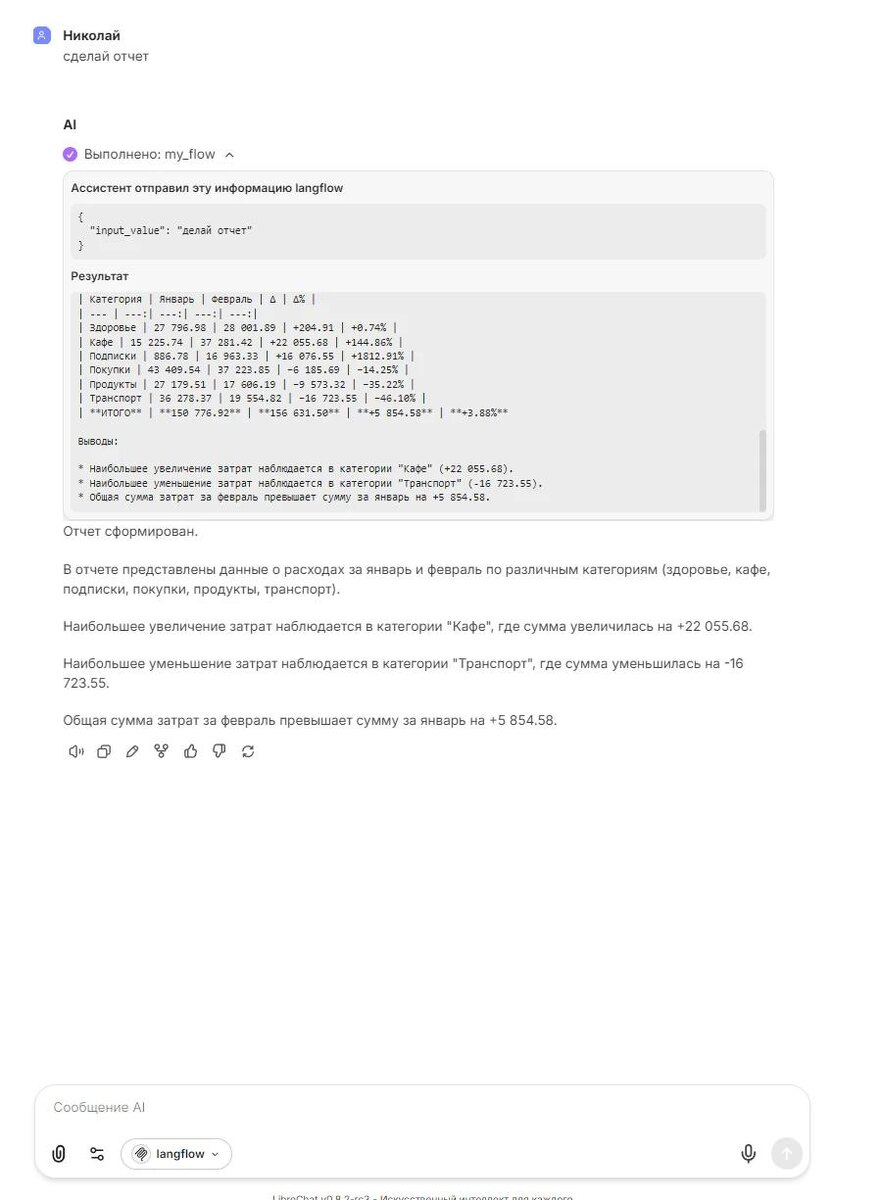 На Тпрогер вышла пошаговая инструкция о том, как поднять локальную агентную AI‑систему из трёх компонентов: — LibreChat — удобный UI для общения с LLM — MCP‑сервер — стандартный доступ к файлам и инструментам — Langflow — визуальный конструктор для многоступенчатых сценариев (с валидацией и расчётами) Всё работает в изолированной Docker‑сети. Данные никуда не уходят. В статье готовые docker-compose.yml, конфиги librechat.yaml, пример кастомного Python‑компонента для расчётов и таблиц, а также схемы работы каждого этапа. @tproger Читайте также в VK, Max и Дзен